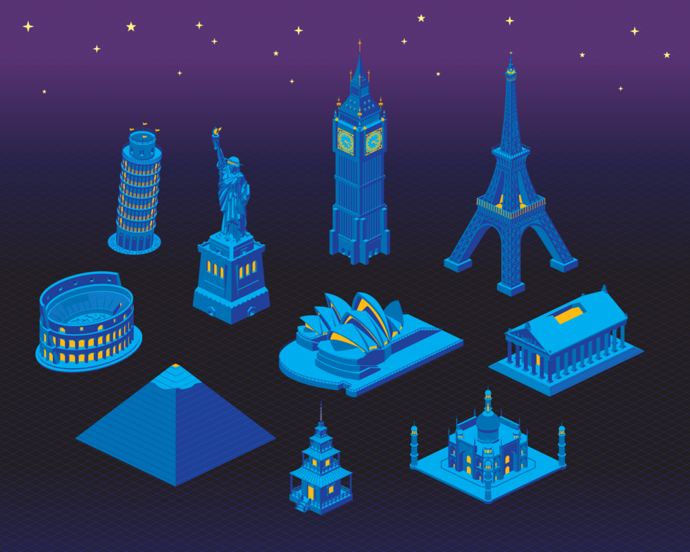 Some of the most recognizable buildings from around the world done in an isometric icon design. Includes vector formats for each building that can be scaled to any size and recolored. If interested in a custom building please contact me.